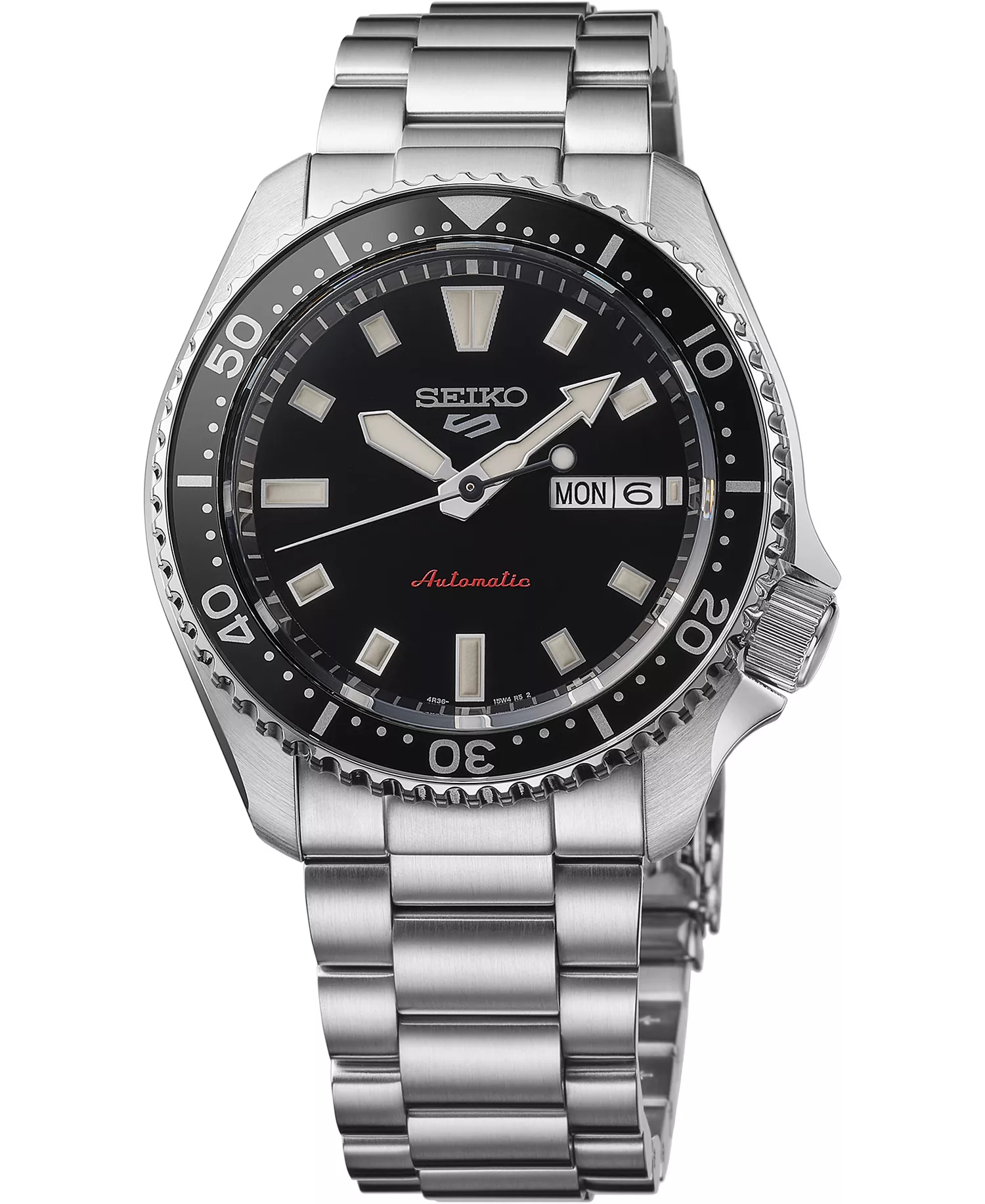 Seiko Prospex dive watch with stainless steel bracelet and black dial.